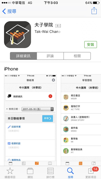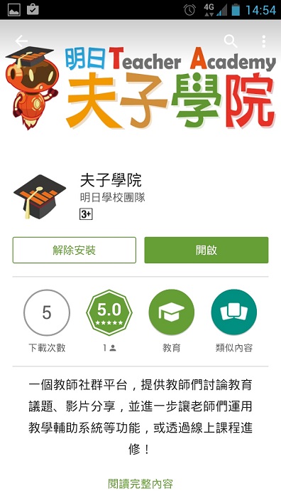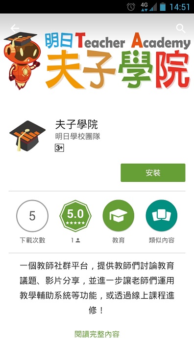 1.Android請開啟「Play商店」,iOS請開啟「itunes store」 搜尋關鍵字「夫子」或是「夫子學院」並開啟下載頁面。(如圖1、2 畫面)