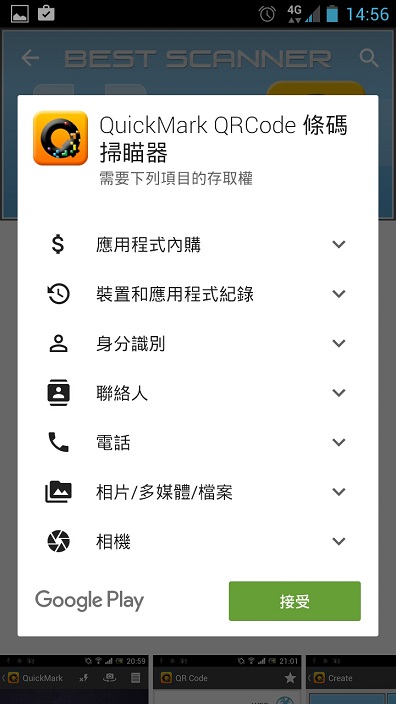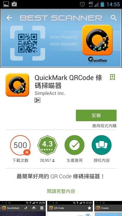 1.Android手機的使用者請開啟手機中的「Play商店」, 搜尋關鍵字「quickmark」開啟下載頁面。(如圖3、4 畫面)