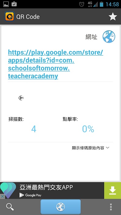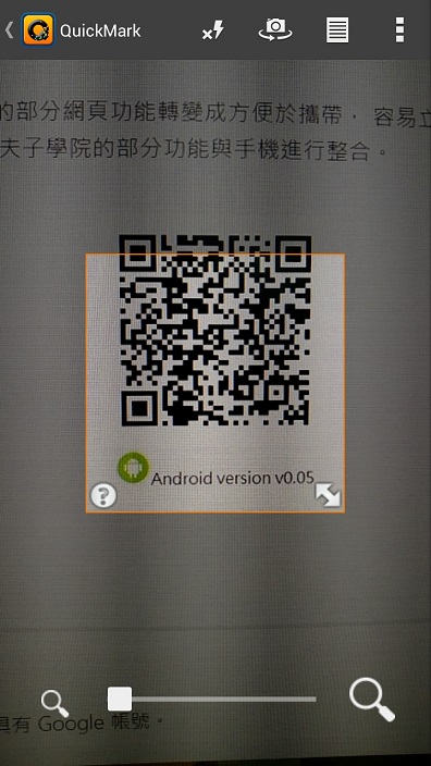 2.開啟「quickmark」,將掃描畫面對準頁面上的 QRCode,如果掃描成功,會找到位於「Play商店」, 的「夫子學院」APP點擊開啟網址。(如圖5、6 畫面)