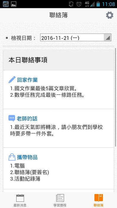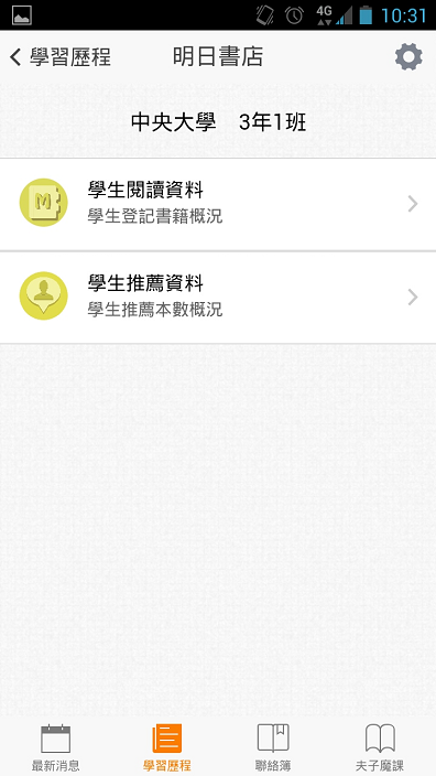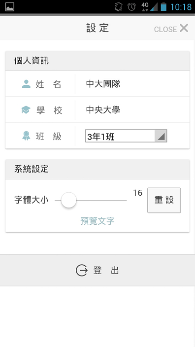 1.下載並開啟APP後,必須要有明日學校帳號及密碼才可以登入夫子APP,如果要登出,請點選畫面右上方的設定,可以調整字體大小、更改班級資訊與登出夫子APP。(如圖1、2所示)