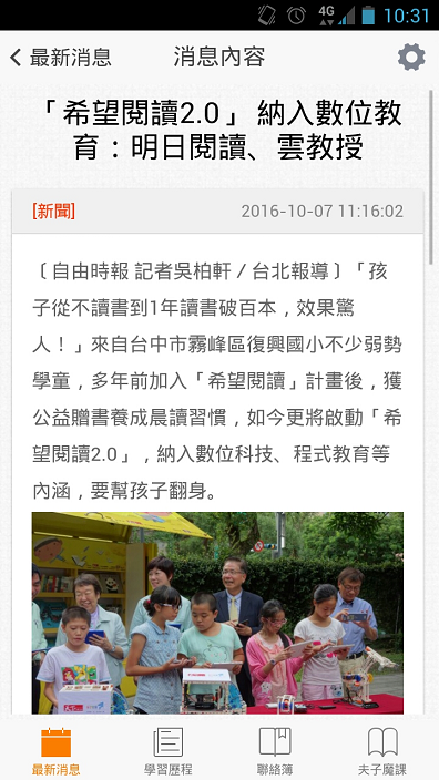 會先列出最新十筆消息列表,點擊各標題及可查看完整內容,欲返回列表,可點擊左上方返回鍵。(如圖3、4所示)