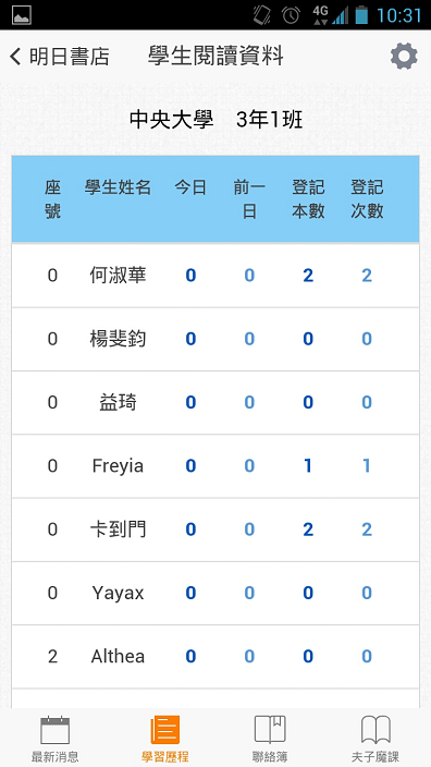 會列出有在使用的系統,點擊系統名稱可進入查看,各系統會區分不同的指標頁籤,再次進入可查看全班數據。以「明日書店」為例,其下分為 「學生閱讀資料」與「學生推薦資料」,再進去則是學生使用狀況的數據。(如圖5、6、7所示)