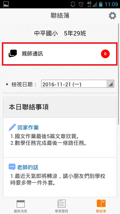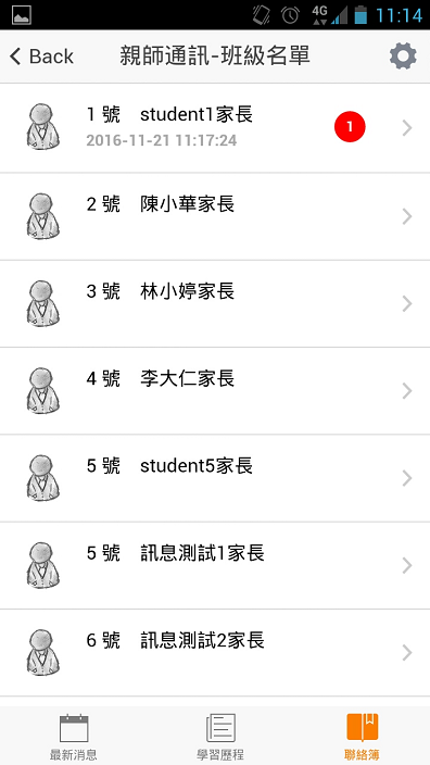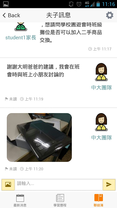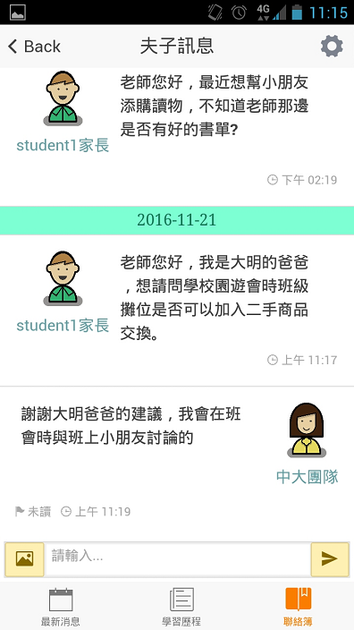 進入聯絡簿會在最上方顯示出現親師通訊,進入後會先顯示未讀新訊息,點擊進入查看訊息內容,點擊「進入班級名單」會列出所有班內家長,找到自己欲聯絡的家長後, 點擊進入該家長視窗,上方會列出本學期歷史訊息;欲傳送訊息,可點擊下方對話框進行編寫,並點擊右方傳送符號送出訊息。(如圖11、12、13所示)