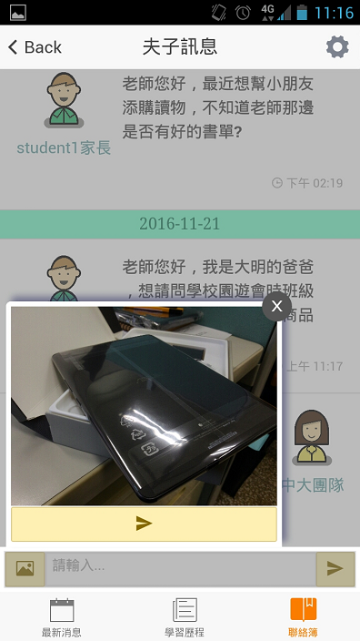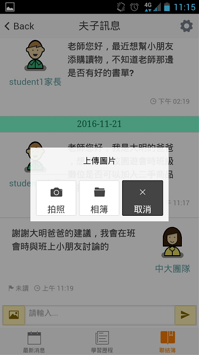 1.若與家長討論的事宜中,須以圖片輔佐,可點擊左方相片符號,選擇拍照上傳或從相簿選取圖片上傳,會於左下角顯示預覽。