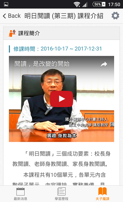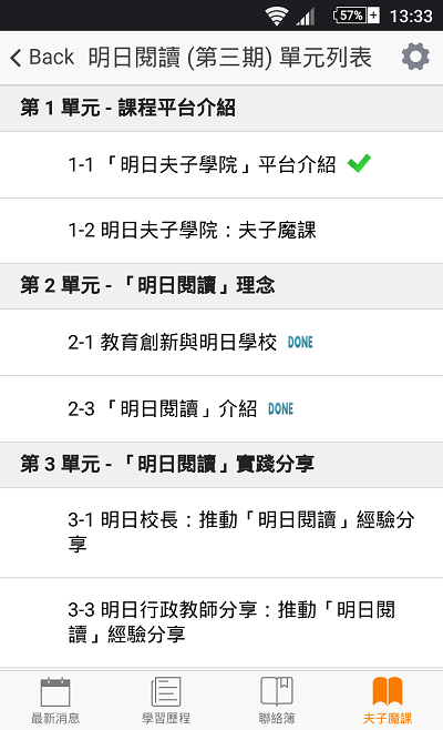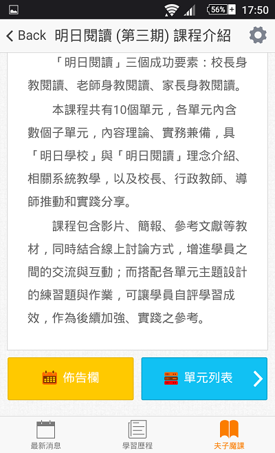 1.進入魔課後會列出學員所屬課程,點擊區塊進入課程,上方為課程介紹,下方可查看佈告欄及進入單元列表。(如圖16、17、18所示)