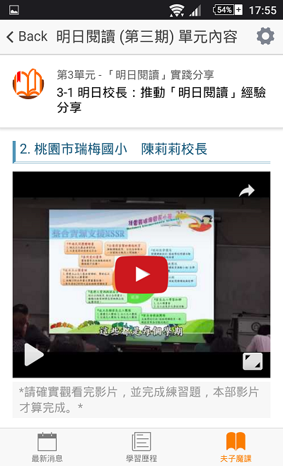 1.需單次完整看完影片才會記錄觀看完畢,子單元所有影片均觀看完畢後,下次進入即可自行控制播放時間軸。